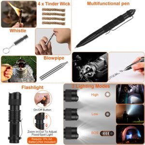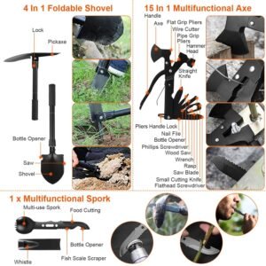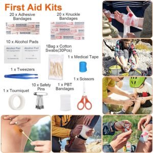 *121Pcs Complete Survival Kit*:This 121Pcs emergency survival kit contains all the items you need for outdoor activities,such as multifunctional axe,shovel,tactical pen,flashlight,raincoat,thermal blanket,first aid kits and so on. Perfect for taking care of any medical or emergency needs during outdoor wilderness adventures.