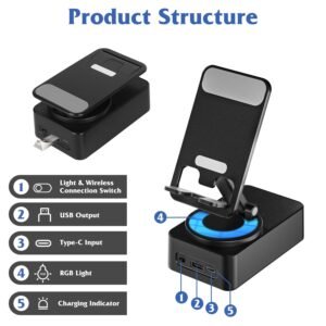 - *Stunning Cool RGB Light*: With 5 RGB light,our wireless audio power phone holder adds a touch of style and fun to your night. It makes the charging experience more enjoyable,adding a bit of flair to your everyday tech. Ideal as a gift for various occasions,it’s sure to be a hit with tech-savvy friends and family.