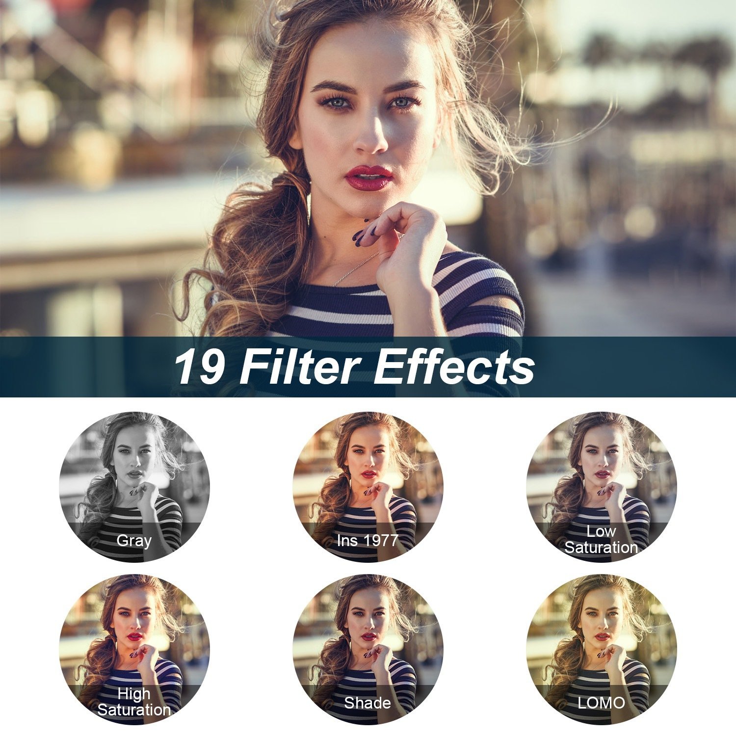 •  19 Filter Effects: None, Gray, Negative, Antique, Red, Green, Blue, Purple, Cyan, Yellow, Ins 1977, Binaryzation, Low Saturation, High Saturation, LOMO, Halo, Cross Printing, Shade, Japanese Color