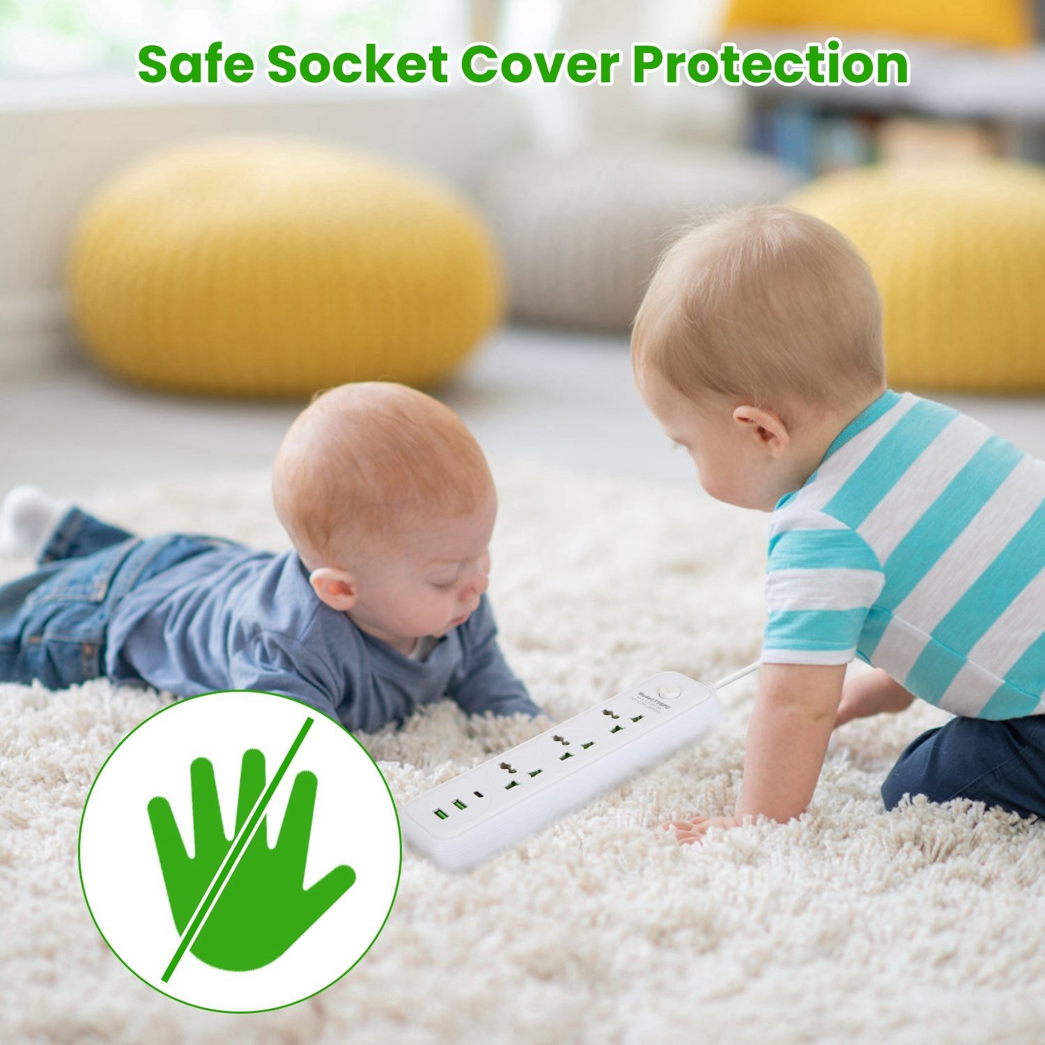 • *Safe Socket Cover Protection*: The safety protection cover is designed to automatically open when the plug is inserted and close when it’s removed,effectively preventing children from inserting their fingers or metal objects into the socket and causing accidents. Additionally,sturdy and impact-resistant material ensures long-term stable operation of this USB power strip.