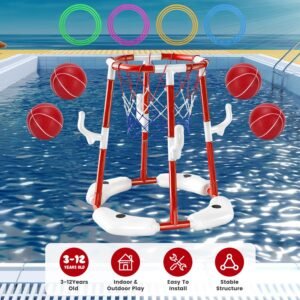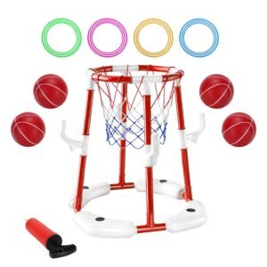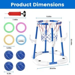 • *Pool Basketball Toy Set*: Our summer pool basketball hoop toy set includes a blue/red basketball hoop,4 balls,4 circles and a convenient pump,designed to bring endless excitement and enjoyment to you and your family. Whether you’re organizing a themed pool party or just looking for ways to enjoy a sunny day,this set is an excellent addition to your summer activities.