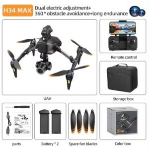 Product DescriptionElevate your aerial photography and flight experience to new heights with the H34 MAX Black Drone—the ultimate combination of professional-grade performance and user-friendly design. Engineered for serious enthusiasts and outdoor adventurers, this foldable quadcopter is packed with premium features including dual electric adjustment cameras, 360° intelligent obstacle avoidance, and dual high-capacity batteries for extended flight time, ensuring you never miss a breathtaking moment. Core Performance & Safety 360° Full-Directional Obstacle Avoidance: Equipped with advanced multi-sensor obstacle avoidance technology, the H34 MAX detects and navigates around barriers in all directions (front/back/left/right/up/down) automatically. Fly with complete confidence in complex environments like forests, urban areas, or mountain trails—collision risks are drastically reduced. Dual Electric Adjustment Camera System: The dual camera setup with electric adjustment function allows you to flexibly switch between lenses and adjust the shooting angle remotely. Capture ultra-clear aerial photos and smooth videos from bird’s-eye view to eye-level perspective, perfect for travel vlogging, landscape photography, and event recording. Dual Battery Long Endurance: Comes with 2 high-performance rechargeable batteries, doubling the flight time compared to single-battery models. Enjoy uninterrupted aerial exploration and avoid the hassle of frequent charging, ideal for all-day outdoor adventures. Convenience & Portability Foldable Compact Design: The H34 MAX features a foldable frame that shrinks to a compact size, easily fitting into the included sturdy storage box. Take it hiking, camping, traveling, or on road trips—portability redefined for on-the-go pilots. Complete All-in-One Package: The kit includes everything you need to start flying immediately: 1 H34 MAX drone, 1 FPV remote control, 2 rechargeable batteries, spare propeller blades, a full set of accessories (charging cable, screwdriver, etc.), a storage box, and a color gift box—perfect for personal use or gifting. Whether you’re a photography enthusiast chasing cinematic shots or a hobbyist seeking reliable, high-performance flight, the H34 MAX Black Drone delivers unmatched value and performance in its class.