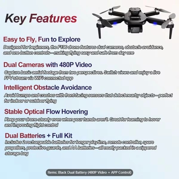 Easy to Fly, Fun to ExploreDesigned for beginners, the F196 drone features dual cameras, obstacle avoidance,and one-button controls-making flying easyand safe from day one