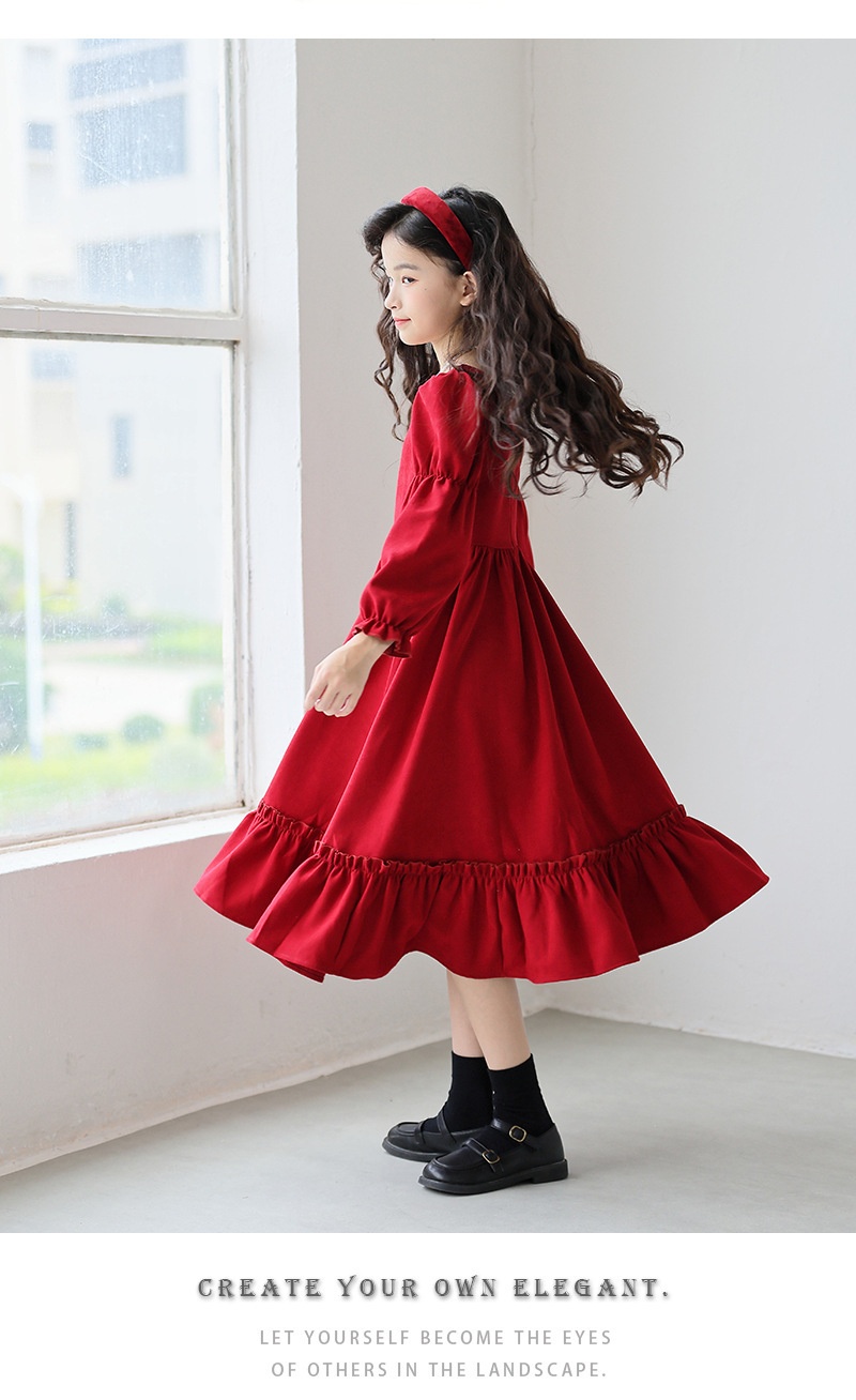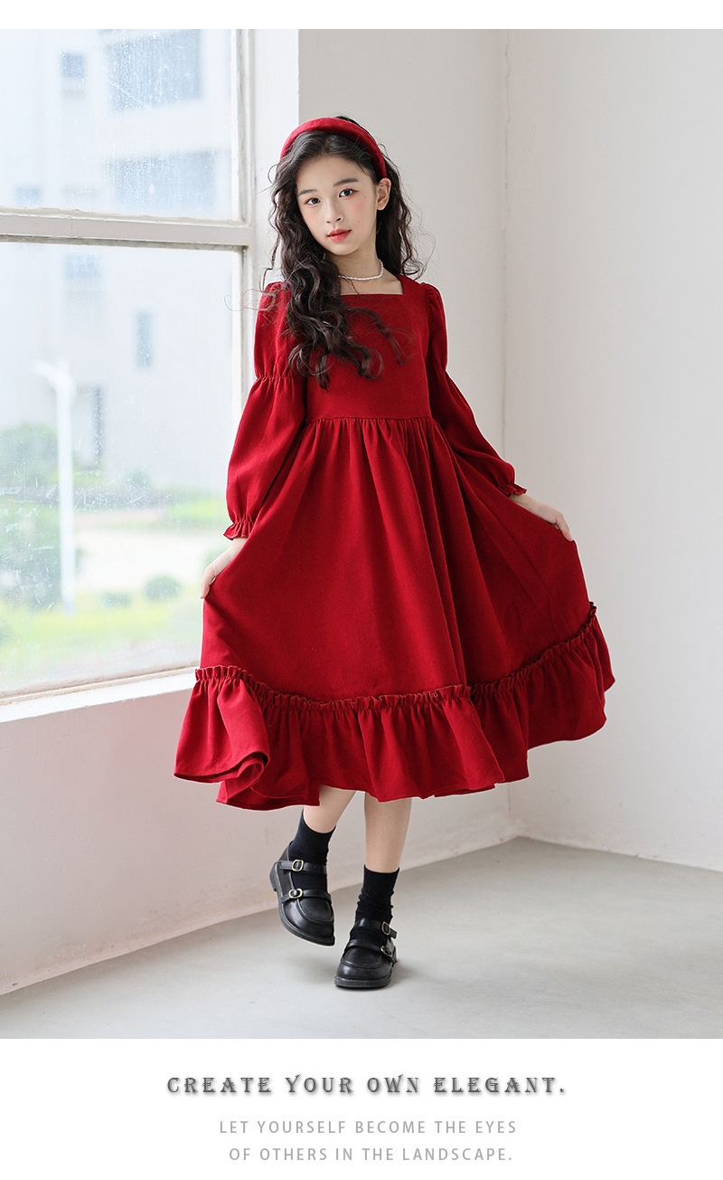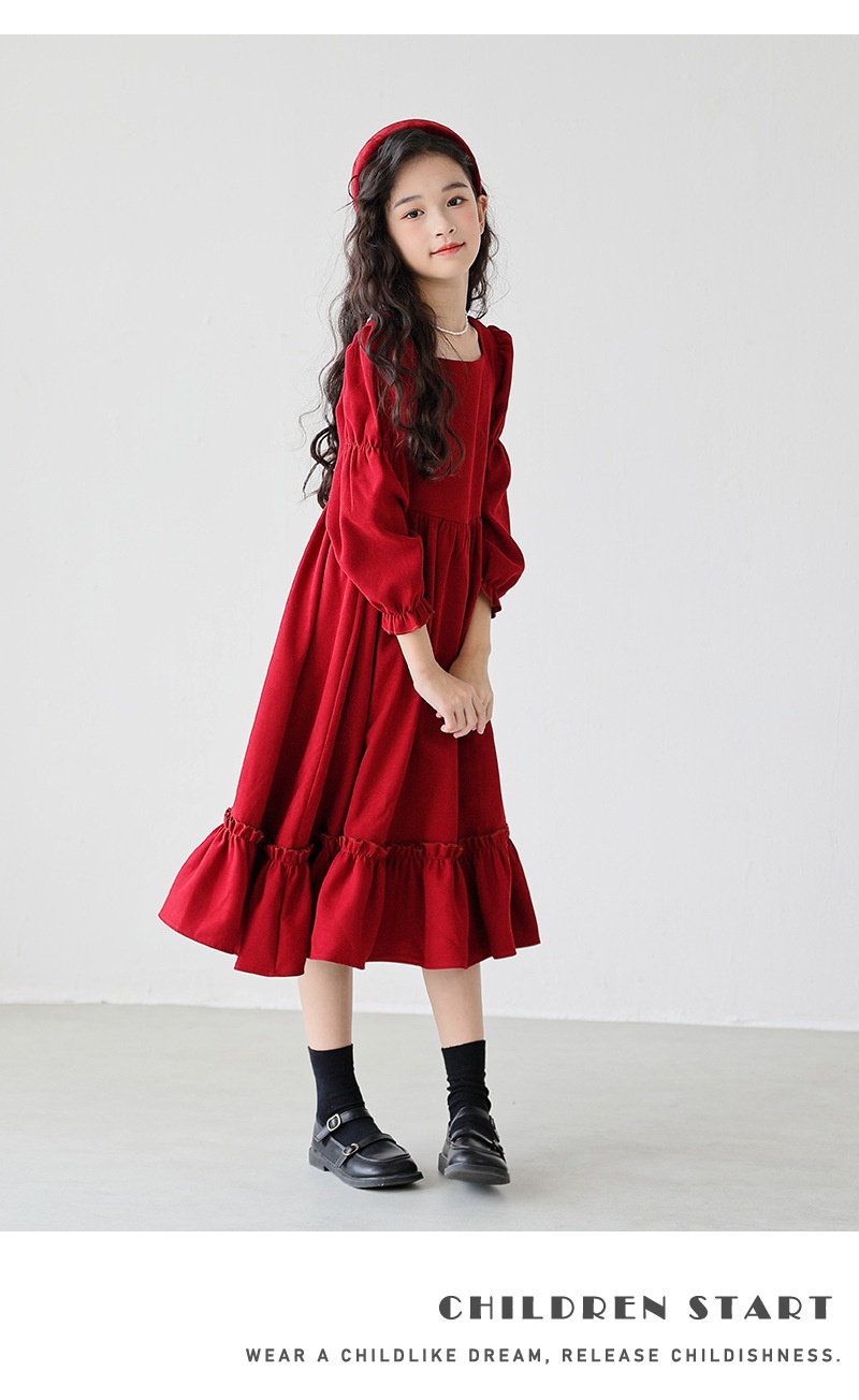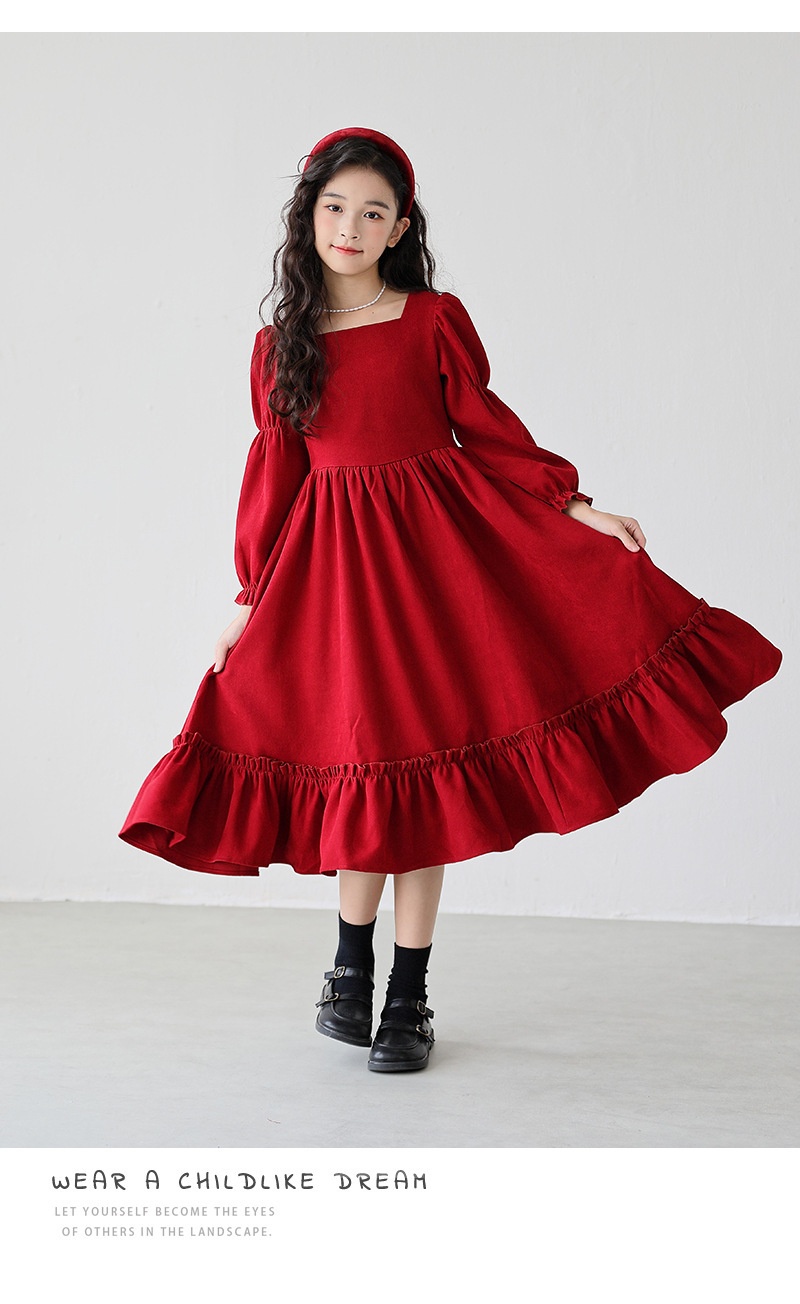Girl’s Long Sleeve Solid Color Square Neck Simple Dress