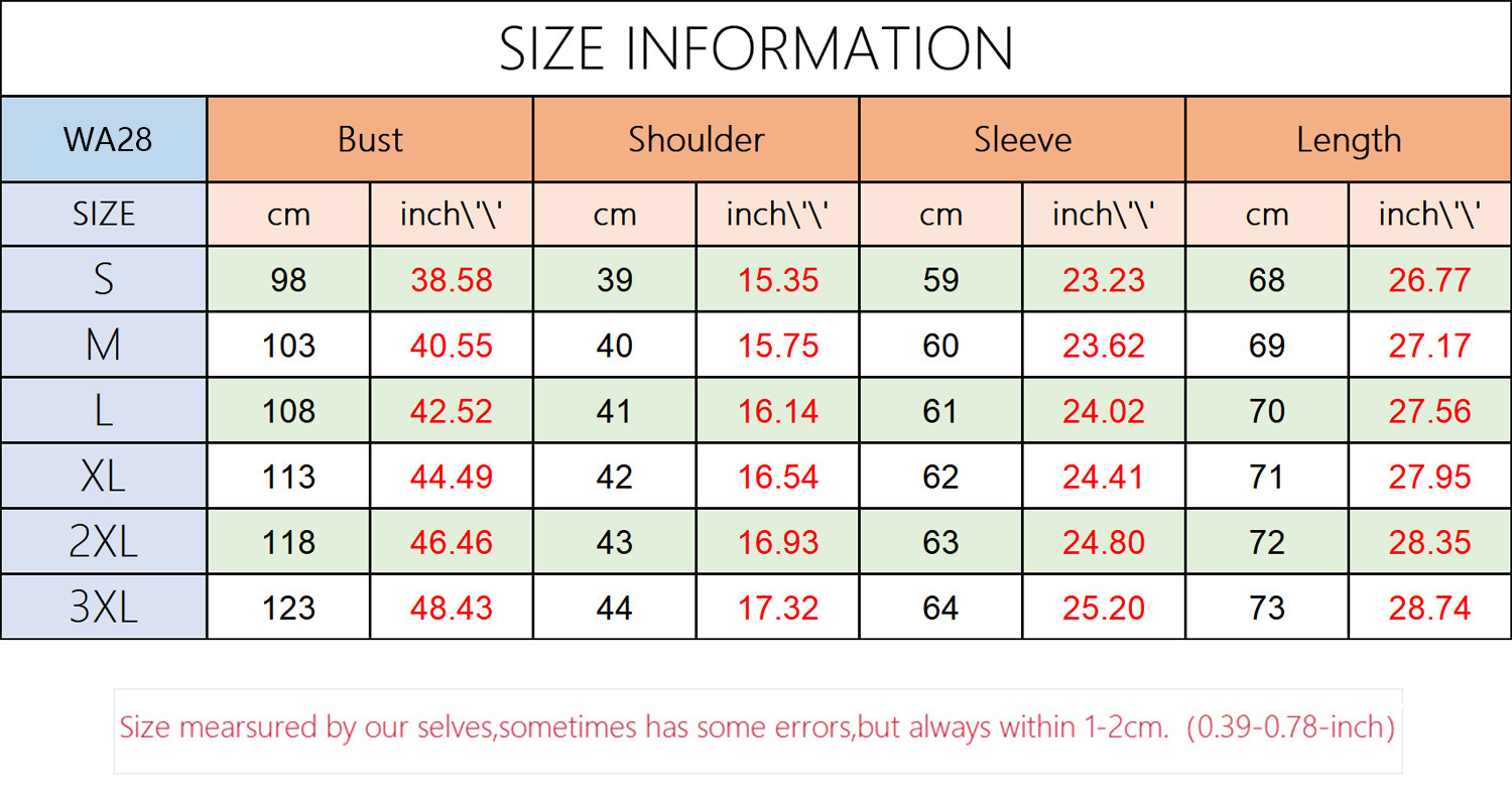 Note: 1. Asian sizes are 1 to 2 sizes smaller than European and American people. Choose the larger size if your size between two sizes. Please allow 2-3cm differences due to manual measurement. 2. Please check the size chart carefully before you buy the item, if you don’t know how to choose size, please contact our customer service. 3.As you know, the different computers display colors differently, the color of the actual item may vary slightly from the following images.