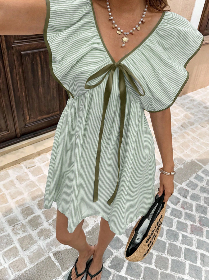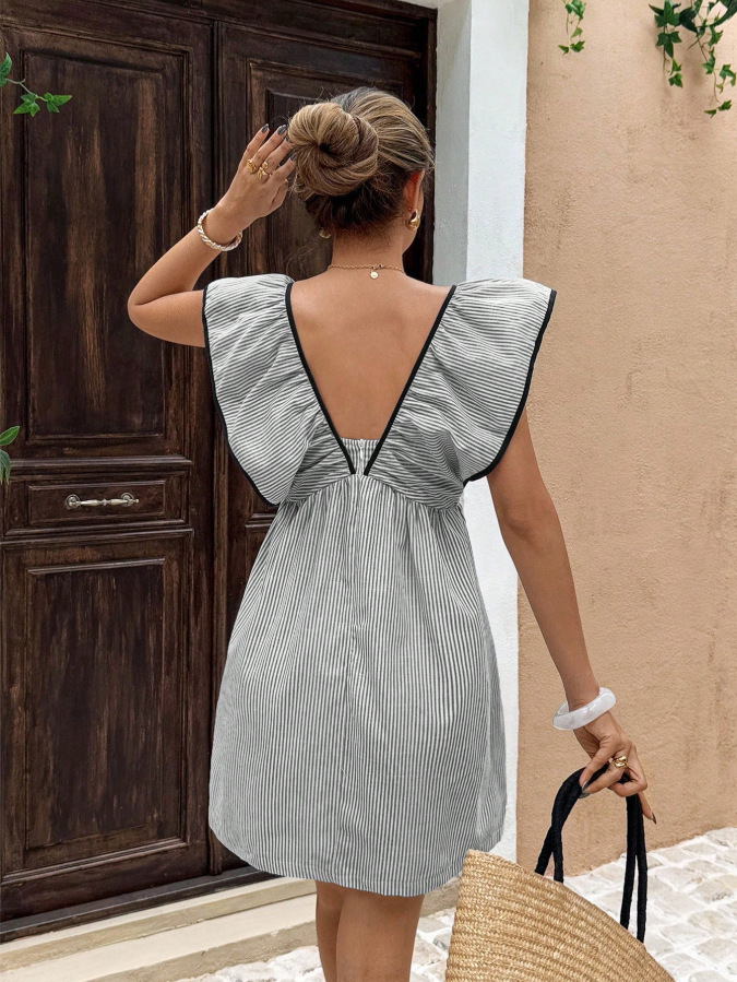 New V-neck Ruffled Flutter-sleeve Dress