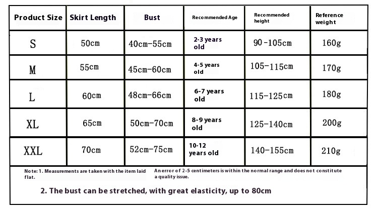 Suitable height: S(2-3T),M(4-5Y),L(6-7Y),XL(8-9Y),XXL(10-12Y)