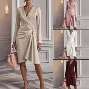 3 reviews for V Neck Folds Solid Color Slim-fit Long Sleeve V-pleated Design Dress Women’s Office Commuter A-line Midi Party Dresses Female Clothing